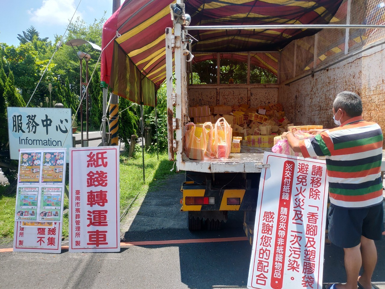清明期間各納骨塔都會封爐,紙錢由「台南天府保全運鈔車」集中載運至「淨圓滿」紙錢專爐燒化。為避免香腳餘燼在載運過程復燃發生危險,環保局提醒鄉親,祭拜時請不要在紙錢上插香,香支祭拜後請插在各祭祀桌的小香爐或插香器上。交付紙錢前,請先自主將塑膠袋及雜物移除,讓集運工作能更安全順利進行。