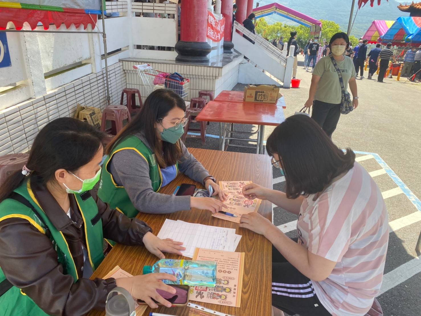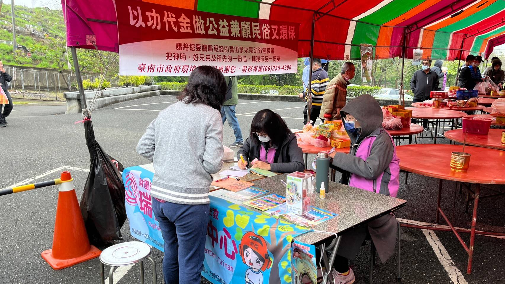 清明節返鄉至新營福園祭祖的吳太太說到,過去拜拜都會燒紙錢表達敬意,幾年前看見家扶中心擺攤推廣「以功代金」,發現立意很棒,這幾年來到塔裡拜拜都採以功代金。