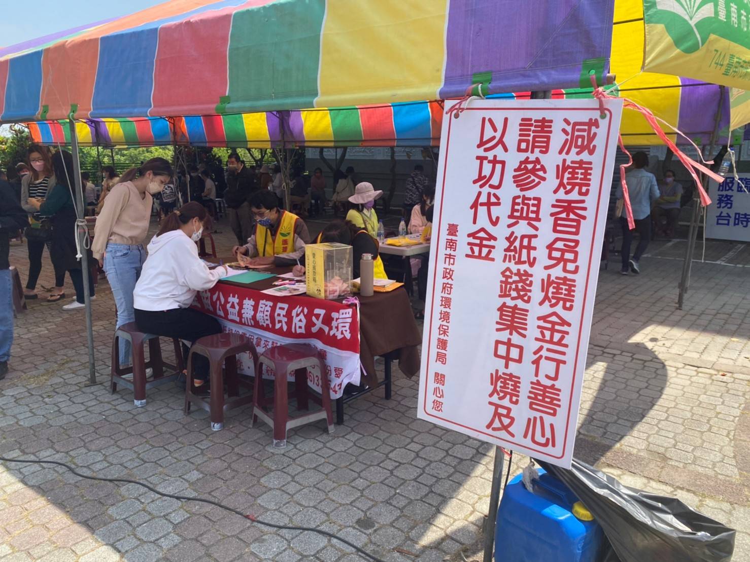 清明期間臺南市環保局與社福團體合作推動「以功代金」,邀祭祖民眾將購買紙錢的費用轉做公益並累積功德,3月19至4月5日在30座公私立納骨塔設宣導攤,近2500人次響應,善款近144萬元,是近三年來最高。超商以功代金捐款也有4.6萬元的好成績。